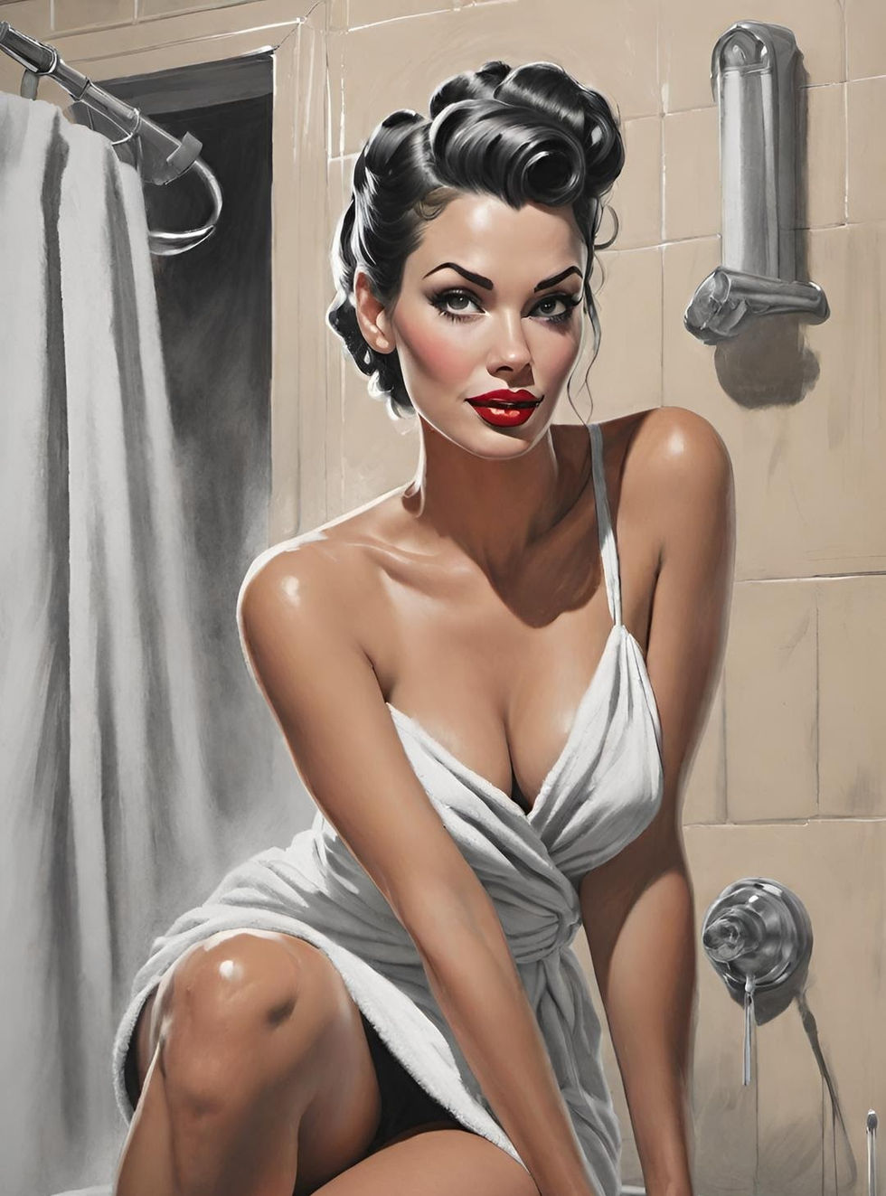 This art project captures the playful, nostalgic charm of vintage Pin-Up style, showcasing glamorous yet candid moments of women in a vibrant bathroom setting. The series explores femininity through the lens of classic beauty ideals, featuring models in poses that evoke mid-20th-century glamour with a modern twist. Set against pastel tiles, retro fixtures, and classic vanity mirrors, each piece reflects iconic elements of the Pin-Up era—polished hair, winged eyeliner, and bold outfits. The juxtaposition of everyday routines in a stylized, intimate space highlights the timeless allure and confidence of Pin-Up icons reimagined in contemporary art.